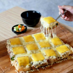Martabak ditabur keju mozzarella yang melimpah serta keju lembaran kemudian dibakar hingga keju meleleh.